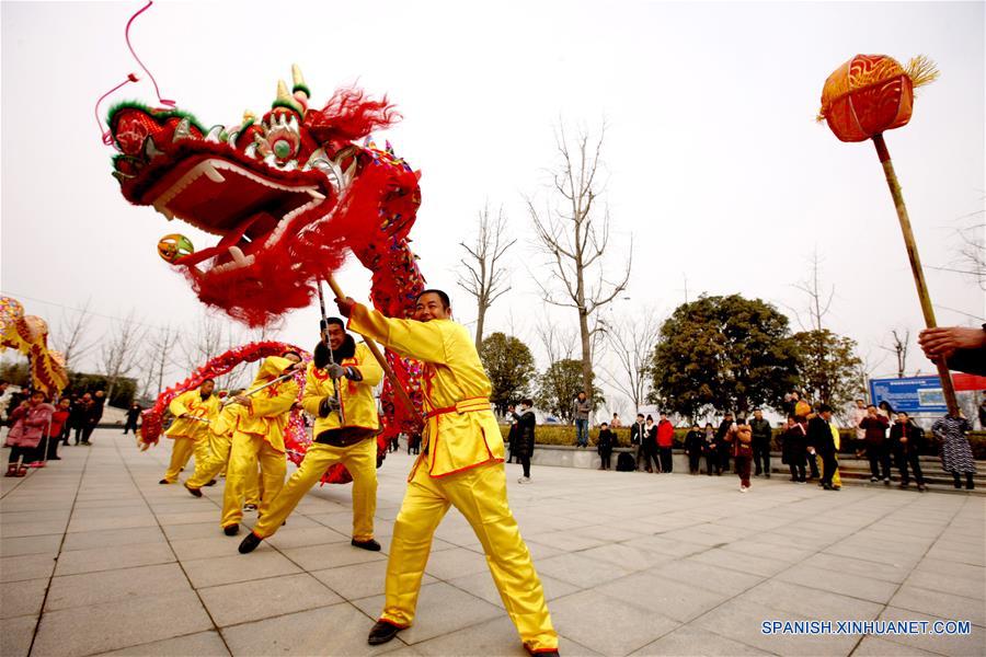 ANHUI, febrero 16, 2018 (Xinhua) -- Agricultores interpretan la danza del dragón en el condado de Mengcheng, provincia de Anhui, en el este de China, el 16 de febrero de 2018. Las personas realizaron diferentes actividades para celebrar el A?o Nuevo Lunar chino en toda China. (Xinhua/Hu Weiguo)