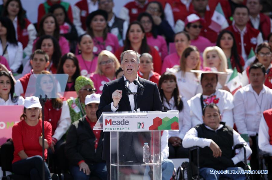 José Antonio Meade (c), candidato a la presidencia de México por el Partido Revolucionario Institucional (PRI), toma protesta ante militantes del partido en el Foro Sol, en la Ciudad de México, capital de México, el 18 de febrero de 2018. (Xinhua/Lucía Flores/Obturador MX)