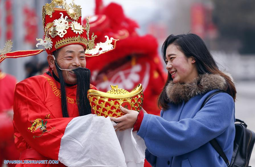 JIANGSU, febrero 20, 2018 (Xinhua) -- Un hombre portando ropaje como el Dios de la Riqueza entrega un regalo a una turista en el quinto día del A?o Nuevo Lunar chino, en Taizhou, provincia de Jiangsu, en el este de China, el 20 de febrero de 2018. En el quinto día del A?o Nuevo Lunar chino es el cumplea?os del Dios de la Riqueza y se cree que trae buena suerte a las personas. (Xinhua/Tang Dehong)