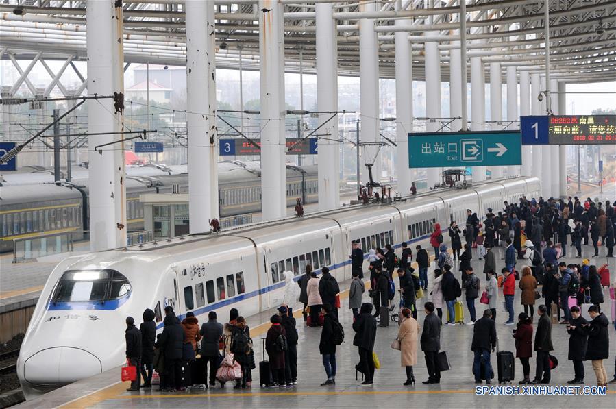 JIANGXI, febrero 21, 2018 (Xinhua) -- Pasajeros se forman para abordar un tren en la Estación del Ferrocarril de Jiujiang, en Jiujiang, provincia de Jiangxi, en el este de China, el 21 de febrero de 2018. El número de pasajeros por tren podría aumentar el miércoles, ya que es la última jornada de las vacaciones de una semana de duración por el A?o Nuevo Lunar. Unos 11,8 millones de viajes se harán en la red ferroviaria de China, lo que representa una subida interanual del 7,6 por ciento, ya que la gente regresa de sus pueblos natales. El sistema ferroviario a?adirá 1.091 trenes para satisfacer la demanda de viaje, de acuerdo con la Corporación de Ferrocarriles. (Xinhua/Hu Guolin)