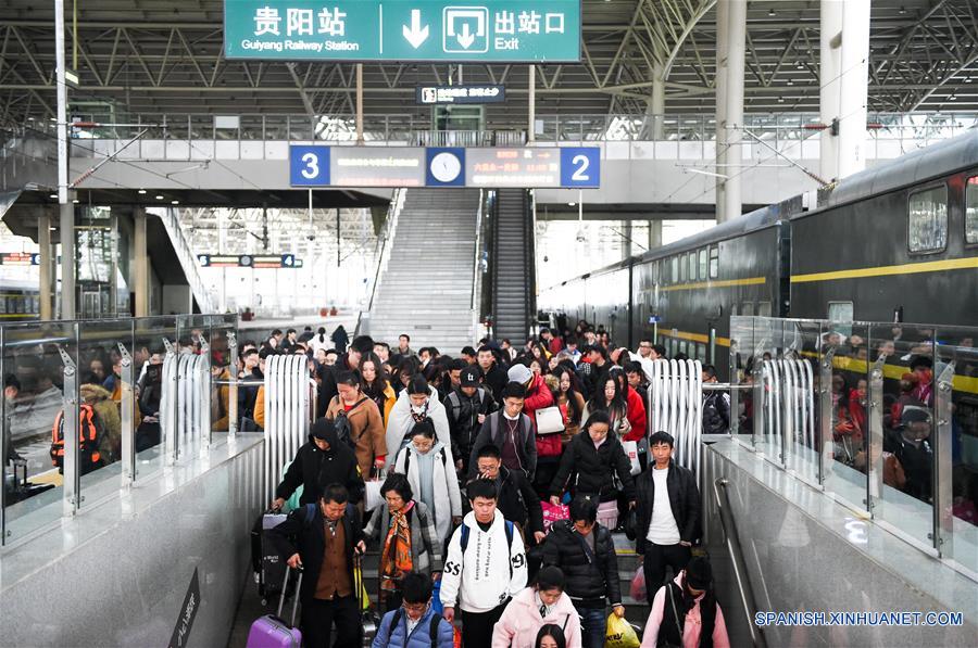 GUIZHOU, febrero 21, 2018 (Xinhua) -- Pasajeros abarrotan la Estación del Ferrocarril de Guiyang, en Guiyang, provincia de Guizhou, en el suroeste de China, el 21 de febrero de 2018. El número de pasajeros por tren podría aumentar el miércoles, ya que es la última jornada de las vacaciones de una semana de duración por el A?o Nuevo Lunar. Unos 11,8 millones de viajes se harán en la red ferroviaria de China, lo que representa una subida interanual del 7,6 por ciento, ya que la gente regresa de sus pueblos natales. El sistema ferroviario a?adirá 1.091 trenes para satisfacer la demanda de viaje, de acuerdo con la Corporación de Ferrocarriles. (Xinhua/Tao Liang)