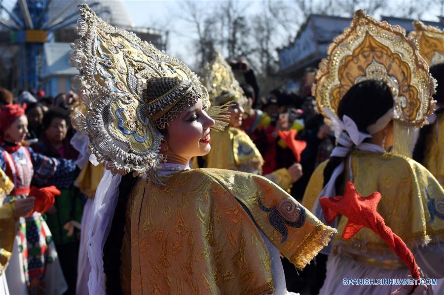 BEIJING, febrero 21, 2018 (Xinhua) -- Una actriz actúa para los visitantes en una feria de templo llevada a cabo en el parque de diversiones Shijingshan, en Beijing, capital de China, el 21 de febrero de 2018. La feria de templo fue llevada a cabo con bocadillos y espectáculos para celebrar la fiesta del Festival de Primevera. (Xinhua/Zhang Chenlin)