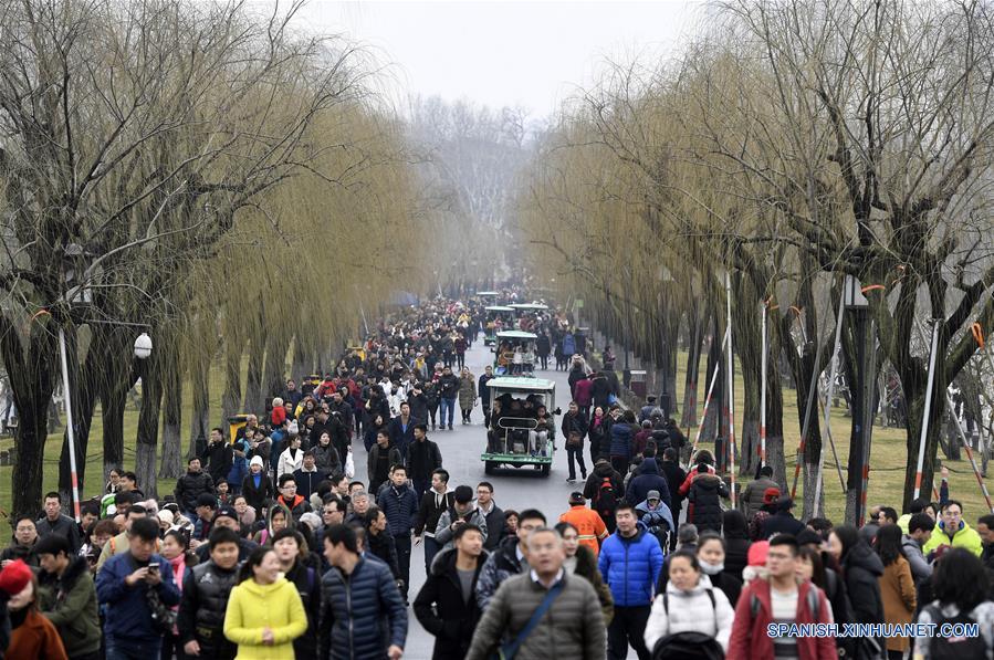 ZHEJIANG, febrero 21, 2018 (Xinhua) -- Turistas visitan la Calzada Baidi en el área escénica del Lago Oeste en el último día de una semana de vacaciones del Festival de Primavera de China, en Hangzhou, capital de la provincia de Zhejiang, en el este de China, el 21 de febrero de 2018. (Xinhua/Huang Zongzhi)
