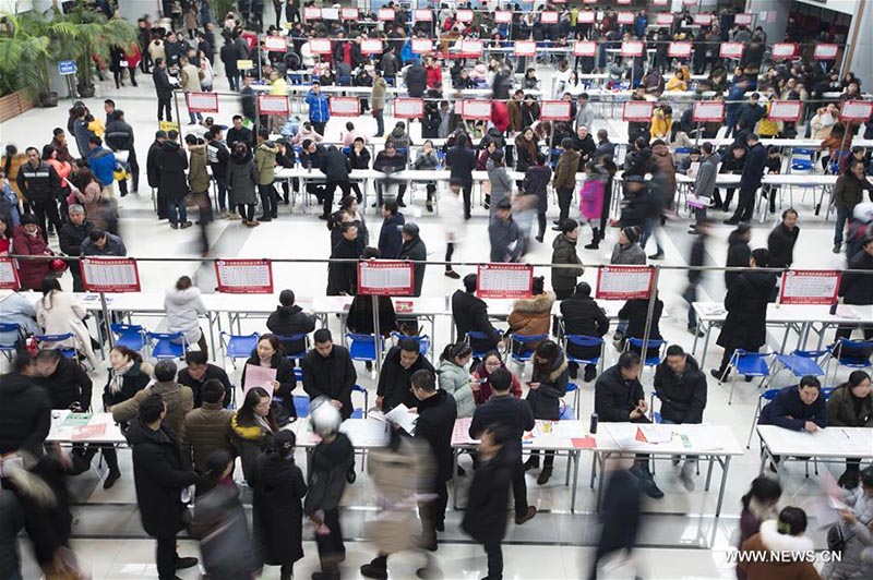 Huai'an, Jiangsu, 22/02/2018(El Pueblo en Línea) - Solicitantes de empleo durante una feria de trabajo en el condado Huai'an, provincia de Jiangsu, el 20 de febrero de 2018. Unas 80 compa?ías ofrecieron más de 7.500 vacantes en la feria. (Xinhua / Zhou Haijun)