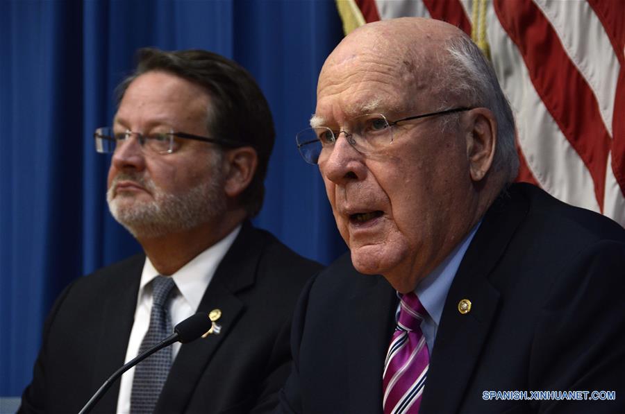 El senador demócrata por el estado de Vermont, Estados Unidos, Patrick Leahy (d), y el senador demócrata por el estado de Michigan, Gary Peters (i), participan durante una conferencia de prensa con la delegación del Congreso de Estados Unidos ofrecida en la embajada de Estados Unidos en Cuba, en La Habana, Cuba, el 21 de febrero de 2018. Una delegación del Congreso estadounidense encabezada por el senador demócrata Patrick Leahy, instó el miércoles al gobierno del presidente Donald Trump a mejorar las relaciones con Cuba en medio de tensiones por presuntos incidentes de salud contra el personal diplomático de Estados Unidos en la isla. En una conferencia de prensa, después de un viaje de tres días a Cuba donde se reunieron con el presidente Raúl Castro y otros funcionarios del gobierno, la delegación del Congreso abordó la necesidad de regresar a una era de compromiso y cooperación. (Xinhua/Joaquín Hernández)