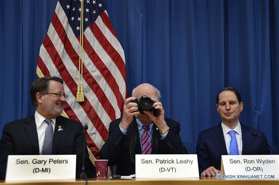 El senador demócrata por el estado de Vermont, Estados Unidos, Patrick Leahy (c), toma una fotografía a los representantes de los medios de comunicación durante una conferencia de prensa con la delegación del Congreso de Estados Unidos ofrecida en la embajada de Estados Unidos en Cuba, en La Habana, Cuba, el 21 de febrero de 2018. Una delegación del Congreso estadounidense encabezada por el senador demócrata Patrick Leahy, instó el miércoles al gobierno del presidente Donald Trump a mejorar las relaciones con Cuba en medio de tensiones por presuntos incidentes de salud contra el personal diplomático de Estados Unidos en la isla. En una conferencia de prensa, después de un viaje de tres días a Cuba donde se reunieron con el presidente Raúl Castro y otros funcionarios del gobierno, la delegación del Congreso abordó la necesidad de regresar a una era de compromiso y cooperación. (Xinhua/Joaquín Hernández)