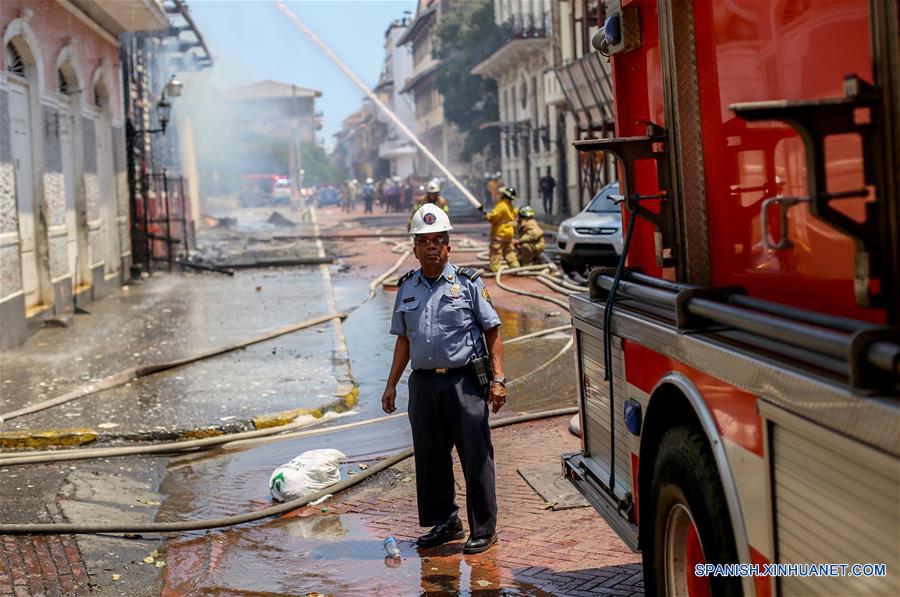 Un integrante del Cuerpo de Bomberos de Panamá reacciona trabaja en el sitio donde se registró un incendio en el barrio de San Felipe, en la Ciudad de Panamá, en Panamá, el 21 de febrero de 2018. De acuerdo con información de la prensa local, alrededor de 55 familias resultaron afectadas luego del incendio registrado en la casa del barco, conocida como "Casa Boyacá", una de las estructuras emplemáticas del Casco Antiguo. (Xinhua/Mauricio Valenzuela)