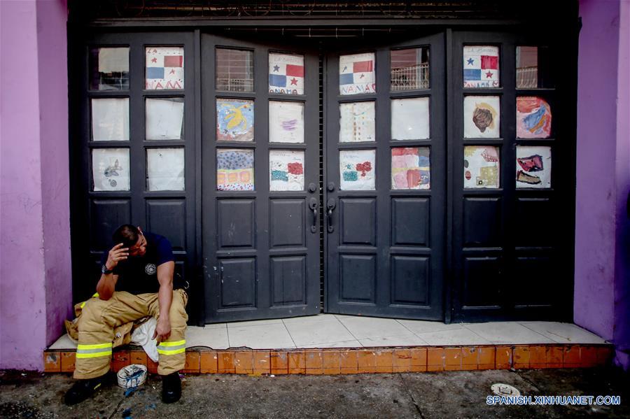 Un integrante del Cuerpo de Bomberos de Panamá descansa después de trabajar en el sitio donde se registró un incendio en el barrio de San Felipe, en la Ciudad de Panamá, en Panamá, el 21 de febrero de 2018. De acuerdo con información de la prensa local, alrededor de 55 familias resultaron afectadas luego del incendio registrado en la casa del barco, conocida como "Casa Boyacá", una de las estructuras emblemáticas del Casco Antiguo. (Xinhua/Mauricio Valenzuela)