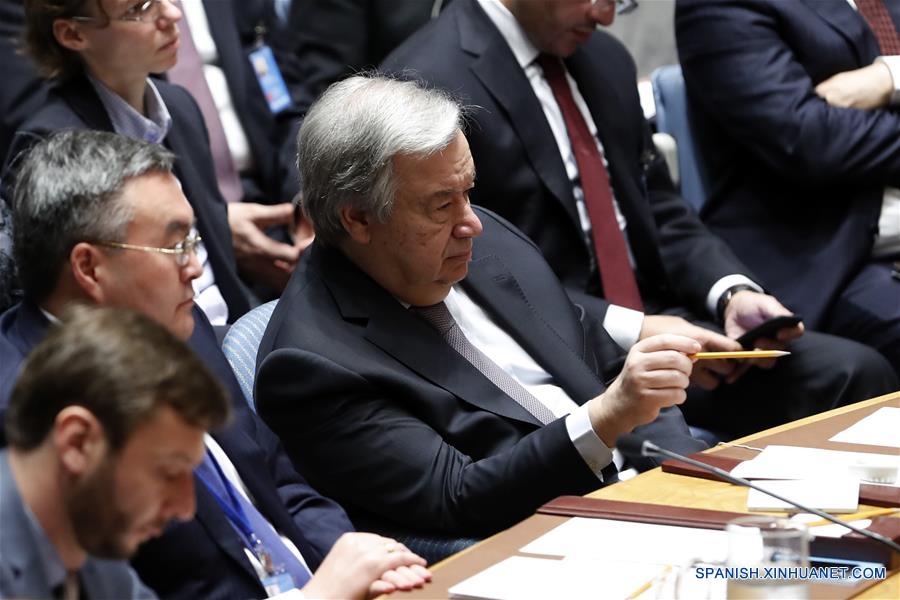 NUEVA YORK, febrero 21, 2018 (Xinhua) -- El secretario general de la Organización de las Naciones Unidas (ONU), Antonio Guterres (d-frente), asiste a una reunión del Consejo de Seguridad sobre los propósitos y principios de la Carta de la ONU en el mantenimiento de la paz y la seguridad internacional, en la sede de la ONU en Nueva York, Estados Unidos, el 21 de febrero de 2018. El secretario general de la ONU, Antonio Guterres, subrayó el miércoles la importancia del enfoque practivo de prevención en lugar de responder a la crisis. (Xinhua/Li Muzi)