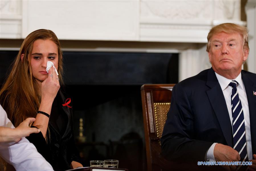 El presidente estadounidense Donald Trump (d), participa durante una sesión de escucha sobre seguridad escolar, en la Casa Blanca, en Washington D.C., Estados Unidos, el 21 de febrero de 2018. El presidente de EEUU, Donald Trump, prometió estrictas verificaciones de antecedentes y controles de salud mental para los compradores de armas, durante una reunión en la Casa Blanca el miércoles con supervivientes y familias de víctimas de tiroteos en centros escolares del país norteamericano. (Xinhua/Ting Shen)