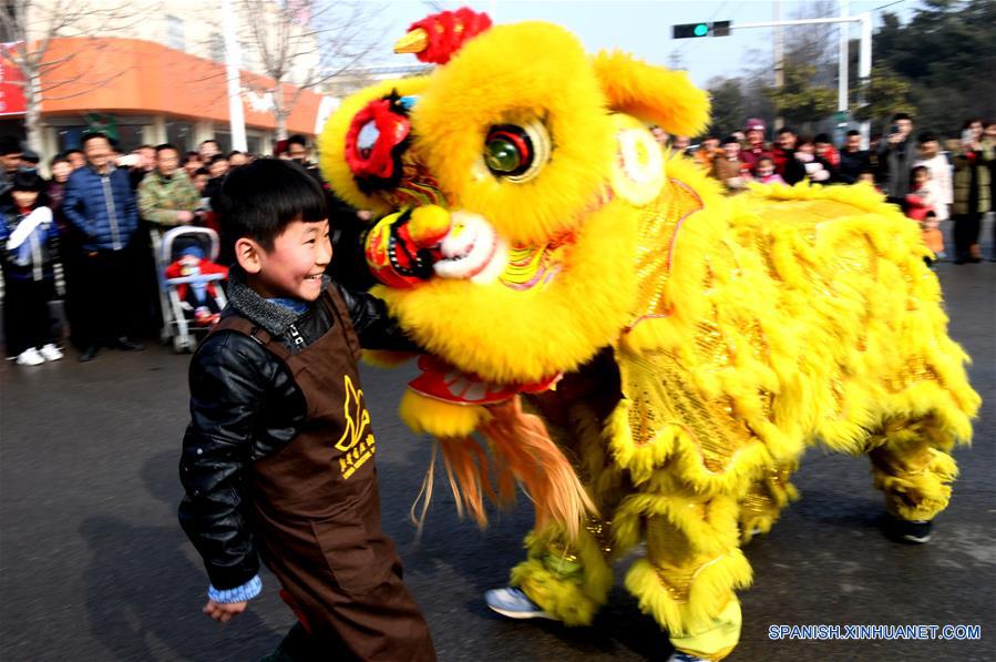 SHANDONG, febrero 22, 2018 (Xinhua) -- Bailarines interpretan la danza del león durante un evento llevado a cabo para celebrar el A?o Nuevo Lunar chino, en Zaozhuang, provincia de Shandong, en el este de China, el 22 de febrero de 2018. (Xinhua/Li Zongxian)
