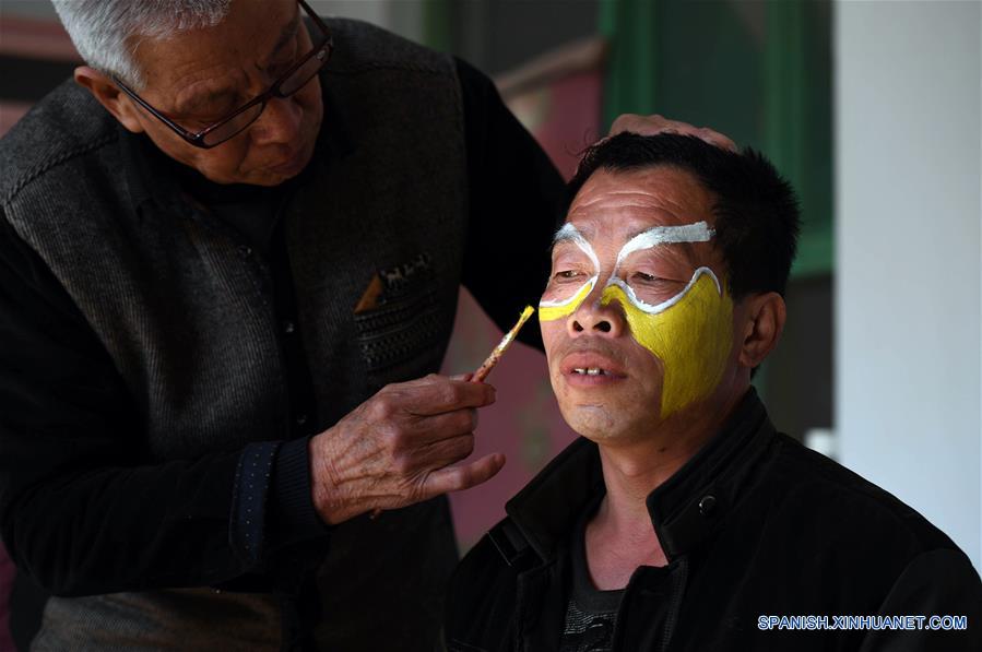 SHANXI, febrero 22, 2018 (Xinhua) -- Imagen del 21 de febrero de 2018 de un artista folclórico siendo maquillado previo a su presentación en zancos durante las vacaciones del A?o Nuevo Lunar chino, en el municipio de Qinghe de la ciudad de Yuncheng, provincia de Shanxi, en el norte de China. La presentación tradicional de "zancos de la bestia" consiste en dos zanqueros que bailan mientras usan el atuendo que se asemeja a los hombres que montan una bestia. (Xinhua/Li Lujian)