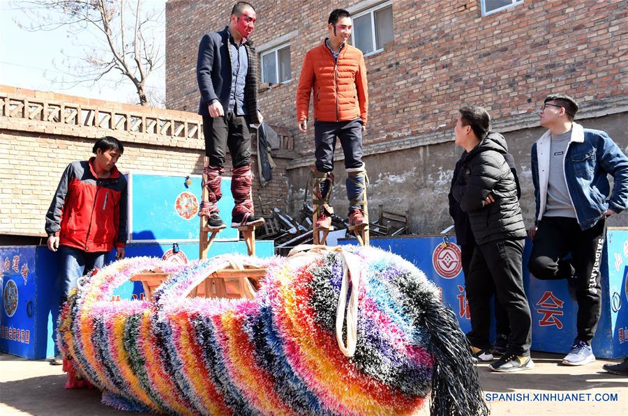 SHANXI, febrero 22, 2018 (Xinhua) -- Imagen del 21 de febrero de 2018 de artistas folclóricos preparándose para su presentación en zancos durante las vacaciones del A?o Nuevo Lunar chino, en el municipio de Qinghe de la ciudad de Yuncheng, provincia de Shanxi, en el norte de China. La presentación tradicional de "zancos de la bestia" consiste en dos zanqueros que bailan mientras usan el atuendo que se asemeja a los hombres que montan una bestia. (Xinhua/Li Lujian)