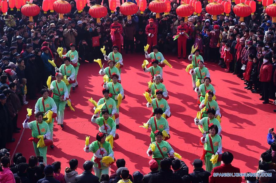 HEBEI, febrero 22, 2018 (Xinhua) -- Bailarinas tocan el tambor de cintura en un evento llevado a cabo para celebrar el A?o Nuevo Lunar chino, en Cangzhou, provincia de Hebei, en el norte de China, el 22 de febrero de 2018. (Xinhua/Fu Xinchun)