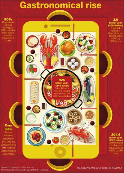 Beijing, 26/02/2018(El Pueblo en Línea) - Las ventas minorista de gastronomía y alimentos en China cifraron 145 mil millones de dólares durante febrero, el mes en que se celebra el Festival de la Primavera.