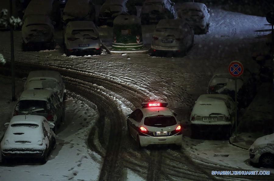 Un vehículo avanza por una calle cubierta de nieve, en Roma, Italia, el 26 de febrero de 2018. De acuerdo con información de la prensa local, tanto Roma como el Vaticano amanecieron el lunes bajo nieve, evento que no ocurría desde hace 6 a?os, por lo que el comité operativo de Protección Civil italiano organizó una reunión para seguir la situación, pues la ola de frío, causada por la tormenta Burian, podría durar al menos 36 horas. (Xinhua/Evandro Inetti/ZUMAPRESS)