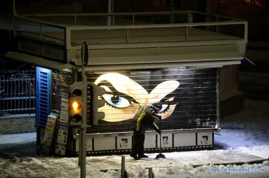 Un hombre limpia una calle cubierta de nieve, en Roma, Italia, el 26 de febrero de 2018. De acuerdo con información de la prensa local, tanto Roma como el Vaticano amanecieron el lunes bajo nieve, evento que no ocurría desde hace 6 a?os, por lo que el comité operativo de Protección Civil italiano organizó una reunión para seguir la situación, pues la ola de frío, causada por la tormenta Burian, podría durar al menos 36 horas. (Xinhua/Evandro Inetti/ZUMAPRESS)