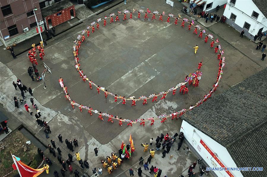 Un equipo femenil de linternas de dragón, realiza la Danza del Dragón con linternas, en la aldea Xinhe, condado de Tonglu, en la provincia de Zhejiang, China, el 26 de febrero de 2018. El espectáculo de linternas de dragón, que usa maderas similares a las bancas, es una manera tradicional de celebrar el inicio de la primavera. (Xinhua/Huang Zongzhi)