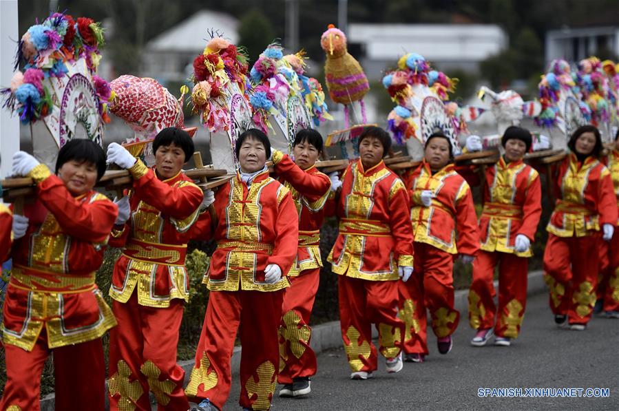 ZHEJIANG, febrero 26, 2018 (Xinhua) -- Un equipo femenil de linternas de dragón, se prepara para realizar la Danza del Dragón con linternas, en la aldea Xinhe, condado de Tonglu, en la provincia de Zhejiang, en China, el 26 de febrero de 2018. El espectáculo de linternas de dragón, que usa maderas similares a las bancas, es una manera tradicional de celebrar el inicio de la primavera. (Xinhua/Huang Zongzhi)