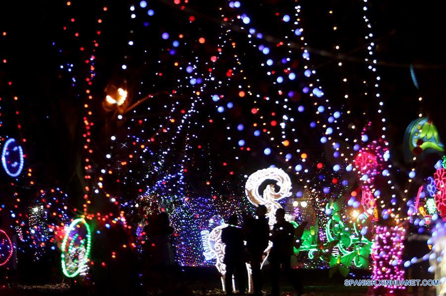 SHANDONG, febrero 26, 2018 (Xinhua) -- Imagen del 25 de febrero de 2018, de turistas observando linternas en un punto escénico, en el condado de Tancheng, en la ciudad de Linyi, en la provincia de Shandong, en el este de China. Lanternas coloridas fueron exhibidas aquí por la llegada del Festival de Linternas. (Xinhua/Zhang Chunlei)