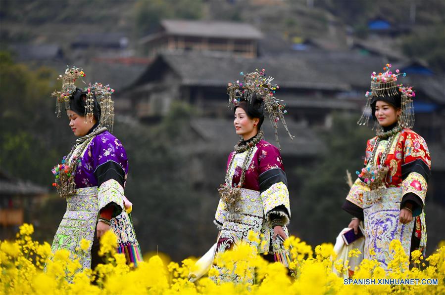Personas usando trajes tradicionales participan en una actividad festiva del lusheng, un instrumento de viento similar a una flauta de ca?a, en la aldea Qiaole, en el condado Rongjiang, en la provincia de Guizhou, en el suroeste de China, el 26 de febrero de 2018. (Xinhua/Wang Bingzhen)