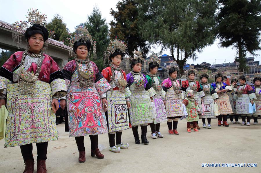 Personas usando trajes tradicionales participan en una actividad festiva del lusheng, un instrumento de viento similar a una flauta de ca?a, en la aldea Qiaole, en el condado Rongjiang, en la provincia de Guizhou, en el suroeste de China, el 26 de febrero de 2018. (Xinhua/Wang Bingzhen)