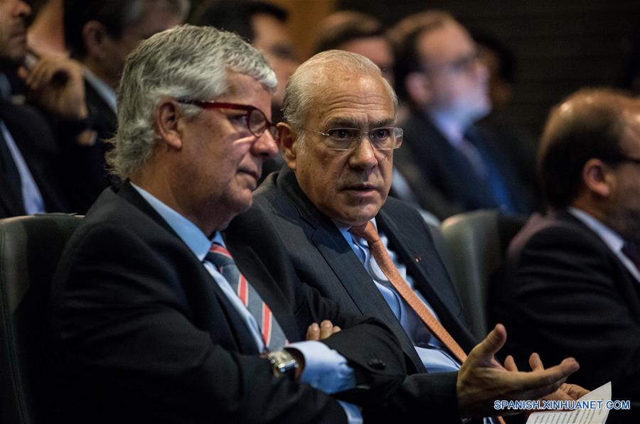 El ministro de Hacienda de Chile, Nicolás Eyzaguirre (i), y el secretario general de la Organización para la Cooperación y el Desarrollo Económicos (OCDE), Angel Gurría (d), conversan durante la presentación de la última edición del Estudio Económico de Chile, en el Centro Cultural Palacio de la Moneda, en Santiago, capital de Chile, el 26 de febrero de 2018. De acuerdo con información de la prensa local, en el Estudio Económico de Chile, elaborado por la OCDE, se mantiene la proyección de crecimiento económico para Chile en un 2.9 por ciento en 2018, mientras que para 2019 prevé una expansión de igual magnitud. (Xinhua/Jorge Villegas)