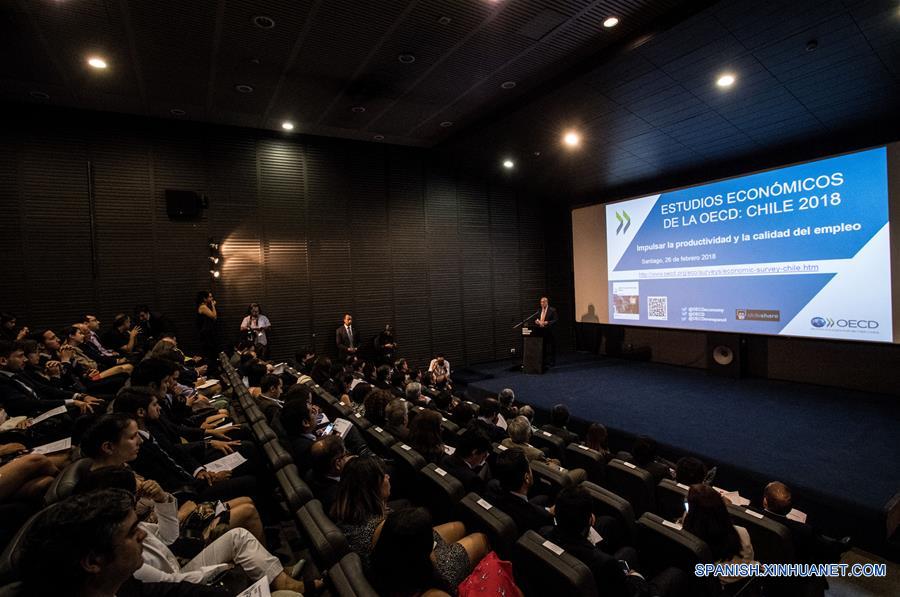 El secretario general de la Organización para la Cooperación y el Desarrollo Económicos (OCDE), Angel Gurría, presenta la última edición del Estudio Económico de Chile, en el Centro Cultural Palacio de La Moneda, en Santiago, capital de Chile, el 26 de febrero de 2018. De acuerdo con información de la prensa local, en el Estudio Económico de Chile, elaborado por la OCDE, se mantiene la proyección de crecimiento económico para Chile en un 2.9 por ciento en 2018, mientras que para 2019 prevé una expansión de igual magnitud. (Xinhua/Jorge Villegas)