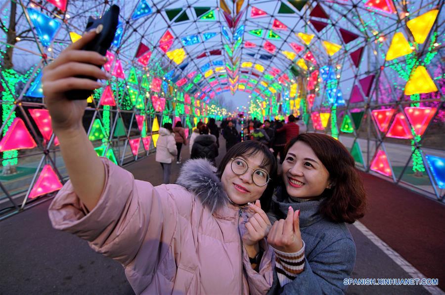 Imagen del 26 de febrero de 2018 de turistas tomándose una "selfie" en una feria de linternas llevada a cabo para saludar al próximo Festival de la Linterna, en el Parque Nanhu en la ciudad de Tangshan, provincia de Hubei, en el centro de China. El Festival de la Linterna se celebra el día 15 de primer mes lunar, o 2 de marzo este a?o. (Xinhua/Dong Jun)