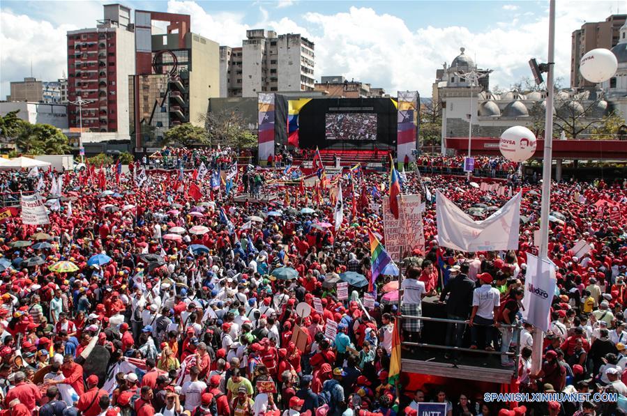 CARACAS, febrero 27, 2018 (Xinhua) -- Personas participan en una movilización para acompa?ar al presidente venezolano Nicolás Maduro a inscribir su candidatura para las elecciones presidenciales en el Consejo Nacional Electoral (CNE), en Caracas, Venezuela, el 27 de febrero de 2018. Maduro asistió el martes a la sede del CNE a presentar su postulación formal para las elecciones presidenciales. Esos comicios, que tradicionalmente se celebran durante diciembre del a?o comicial, fueron adelantados para este primer cuatrimestre por decisión de la Asamblea Nacional Constituyente (ANC). (Xinhua/Boris Vergara)
