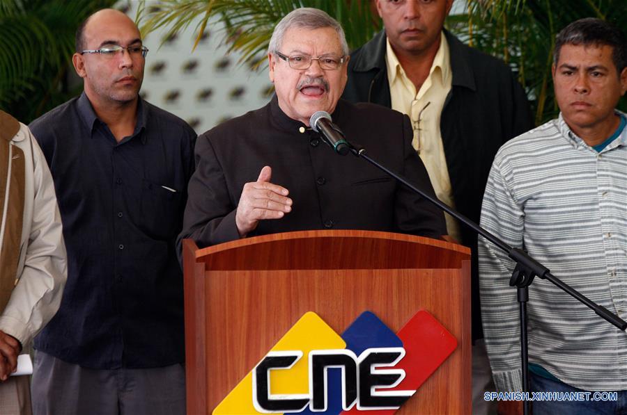 El exmilitar Francisco Visconti Osorio (c), de 72 a?os, pronuncia un discurso en el marco de su inscripción ante el Consejo Nacional Electoral (CNE), en Caracas, Venezuela, el 27 de febrero de 2018. Maduro asistió el martes a la sede del CNE a presentar su postulación formal para las elecciones presidenciales. Esos comicios, que tradicionalmente se celebran durante diciembre del a?o comicial, fueron adelantados para este primer cuatrimestre por decisión de la Asamblea Nacional Constituyente (ANC). (Xinhua/Boris Vergara)