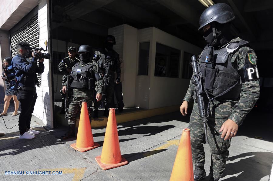 COMAYAGUELA, febrero 28, 2018 (Xinhua) -- Militares hondure?os custodian el edificio de la Agencia Técnica de Investigación Criminal (ATIC) hasta donde llevaron después de su captura a la ex primera dama de Honduras, Rosa Elena Bonilla, esposa del ex presidente hondure?o Porfirio Lobo, en Comayagüela, Honduras, el 28 de febrero de 2018. La ex primera dama de Honduras, Rosa Elena Bonilla de Lobo, fue capturada el miércoles en su casa en Tegucigalpa durante un operativo de la Policía Militar, se?alada de malversación de fondos públicos, informó el Ministerio Público. Las autoridades capturaron también a su cu?ado, Mauricio Mora, vinculado a Rosa Elena por la sustracción de unos 500.000 dólares estadounidenses de la cuenta de la oficina de la ex primera dama, que fueron transferidos a cuentas personales a pocos días de culminar la gestión. El Ministerio Público conoció de la denuncia desde el 2017 y el Tribunal Superior de Cuentas (TSC) investiga a Bonilla debido a la compra irregular de zapatos por un monto de unos 300.000 dólares estadounidenses. De acuerdo con el reporte, desde las 06:00 hora local (12:00 GMT) del miércoles se desplegó un amplio operativo en la casa del ex presidente Porfirio Lobo Sosa (2010-2014) en El Chimbo en el noreste de Tegucigalpa. (Xinhua/Rafael Ochoa)