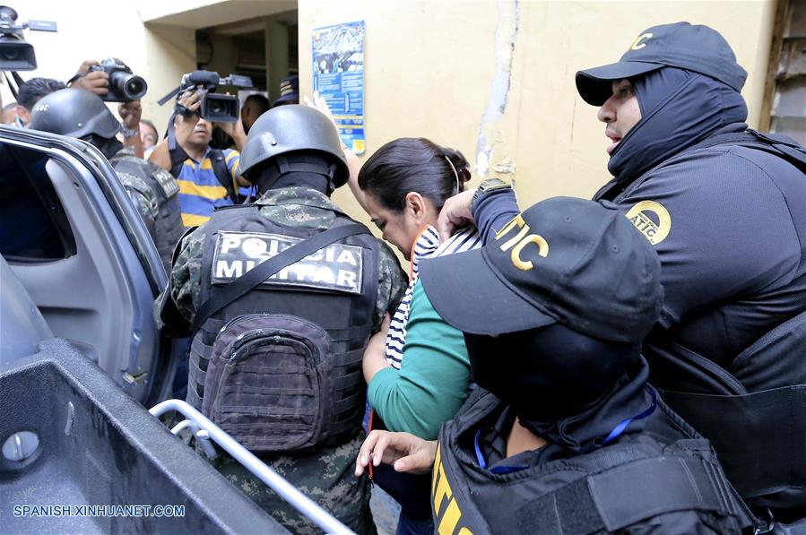 TEGUCIGALPA, febrero 28, 2018 (Xinhua) -- La ex primera dama de Honduras, Rosa Elena Bonilla (c), esposa del ex presidente hondure?o Porfirio Lobo, es trasladada por militares hondure?os e integrantes de la Agencia Técnica de Investigación Criminal (ATIC) a un juzgado en Materia de Corrupción luego de su captura, en Tegucigalpa, Honduras, el 28 de febrero de 2018. La ex primera dama de Honduras, Rosa Elena Bonilla de Lobo, fue capturada el miércoles en su casa en Tegucigalpa durante un operativo de la Policía Militar, se?alada de malversación de fondos públicos, informó el Ministerio Público. Las autoridades capturaron también a su cu?ado, Mauricio Mora, vinculado a Rosa Elena por la sustracción de unos 500,000 dólares estadounidenses de la cuenta de la oficina de la ex primera dama, que fueron transferidos a cuentas personales a pocos días de culminar la gestión. El Ministerio Público conoció de la denuncia desde el 2017 y el Tribunal Superior de Cuentas (TSC) investiga a Bonilla debido a la compra irregular de zapatos por un monto de unos 300,000 dólares estadounidenses. De acuerdo con el reporte, desde las 06:00 hora local (12:00 GMT) del miércoles se desplegó un amplio operativo en la casa del ex presidente Porfirio Lobo Sosa (2010-2014) en El Chimbo en el noreste de Tegucigalpa. (Xinhua/Rafael Ochoa)