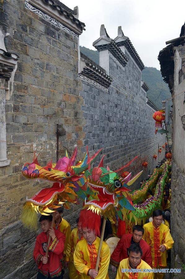 GUIZHOU, febrero 28, 2018 (Xinhua) -- Residentes participan en un desfile de la danza del dragón, en la antigua localidad de Zhaiying del Condado Autónomo Miao de Songtao, en Tongren, provincia de Guizhou, en el suroeste de China, el 28 de febrero de 2018. Un festival cultural de arte de la danza del dragón fue llevado a cabo el miércoles en el lugar. (Xinhua/Li Pingmao)
