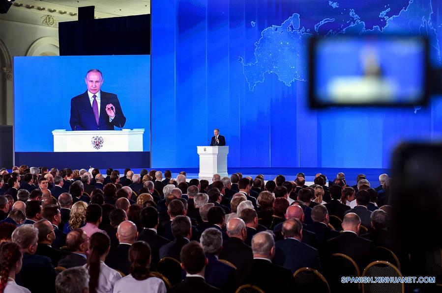 MOSCU, marzo 1, 2018 (Xinhua) -- El presidente de Rusia, Vladimir Putin, pronuncia su discurso anual ante la Asamblea Federal de Rusia, en Moscú, Rusia, el 1 de marzo de 2018. Rusia ha desplegado misiles hipersónicos de alta precisión capaces de penetrar sistemas de defensa "existentes y futuros", según detalló el jueves el presidente del país, Vladimir Putin, en su discurso anual ante la Asamblea Federal de Rusia. (Xinhua/Evgeny Sinitsyn)