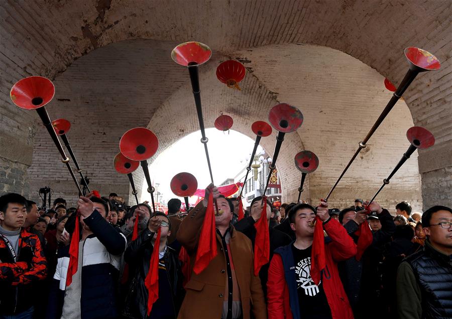 Personas interpretan "shehuo", un entretenimiento popular de China, para celebrar el Festival de la Linterna en una feria de templo en el condado de Junxian, provincia de Henan, en el centro de China, el 2 de marzo de 2018. (Xinhua/Li An)