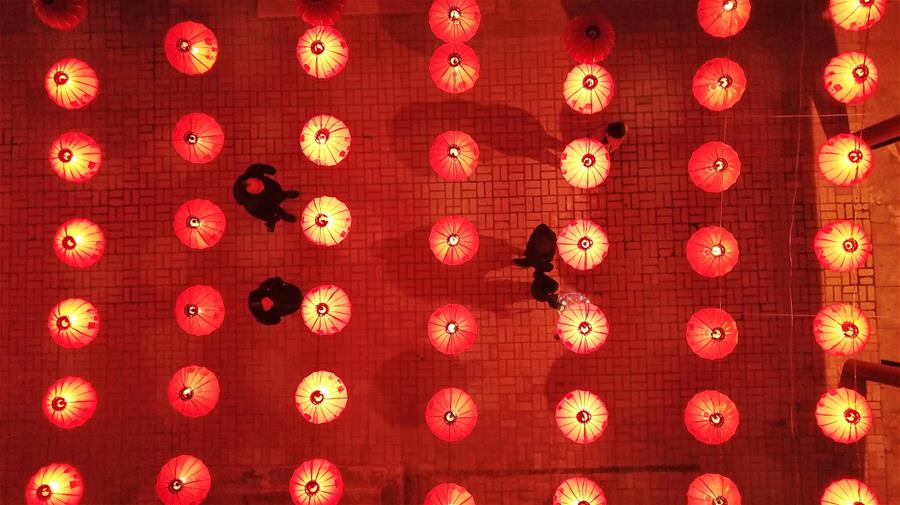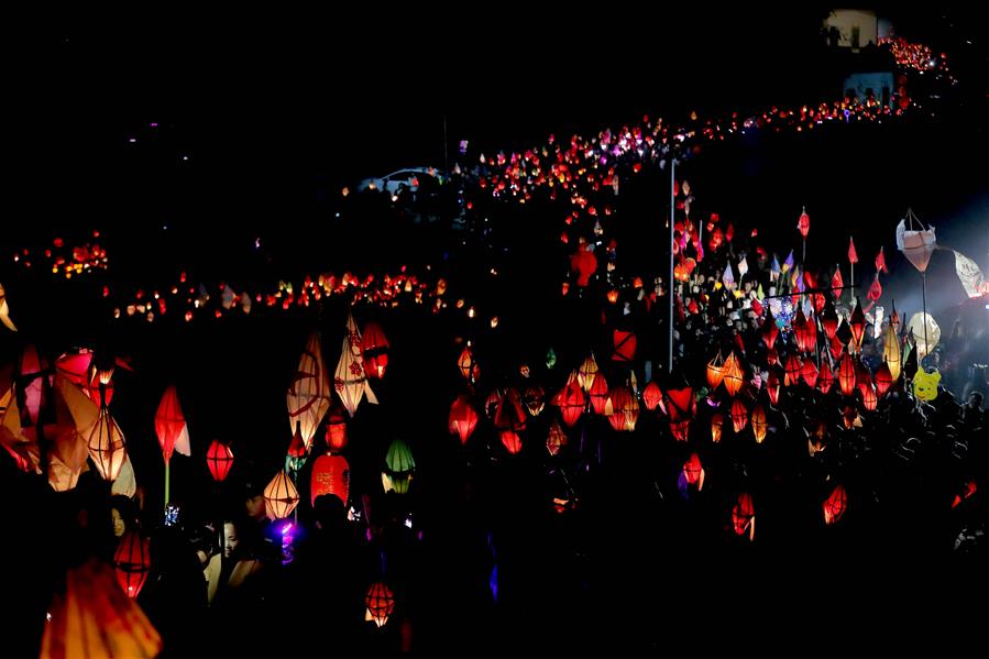 Imagen del 1 de marzo de 2018 de turistas observando las linternas en un evento llevado a cabo para saludar al Festival de la Linterna, en el condado de Danzhai, provincia de Guizhou, en el suroeste de China. El Festival de la Linterna se celebra el 2 de marzo este a?o. (Xinhua/Kai Shangyu)