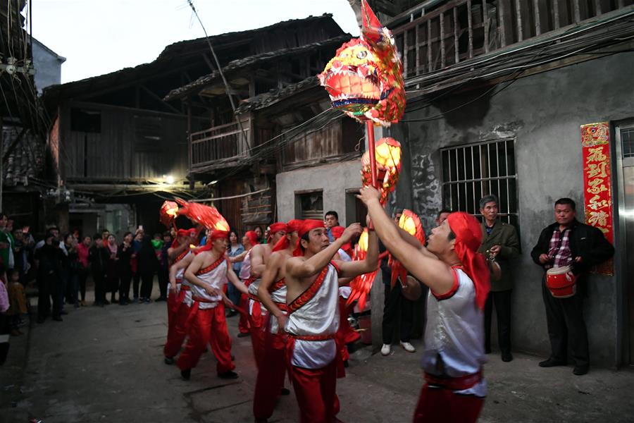 Imagen del 1 de marzo de 2018 de residentes actuando con linternas de carpa para saludar al Festival de la Linterna, en la villa de Xiazhou del condado de Ji'an, provincia de Jiangxi, en el este de China. El Festival de la Linterna se celebra el 2 de marzo este a?o. (Xinhua/Song Zhenping)