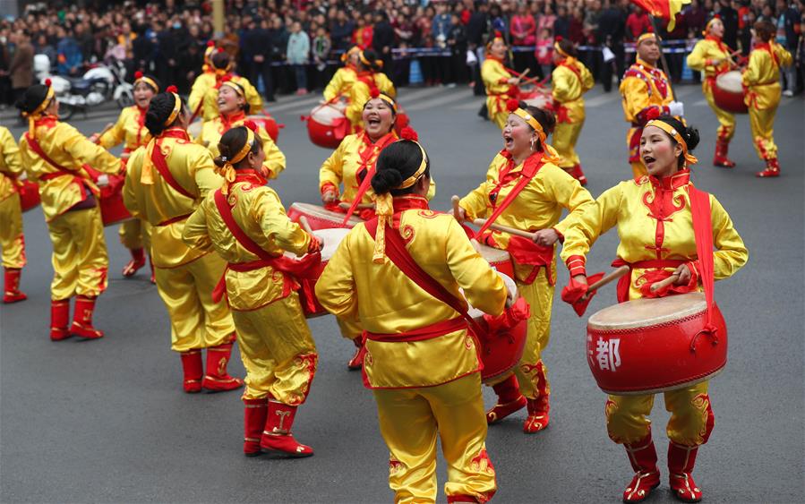 Residentes actúan durante una celebración del Festival de la Linterna llevada a cabo en Emeishan, provincia de Sichuan en el suroeste de China, el 2 de marzo de 2018. (Xinhua/Jiang Hongjing)