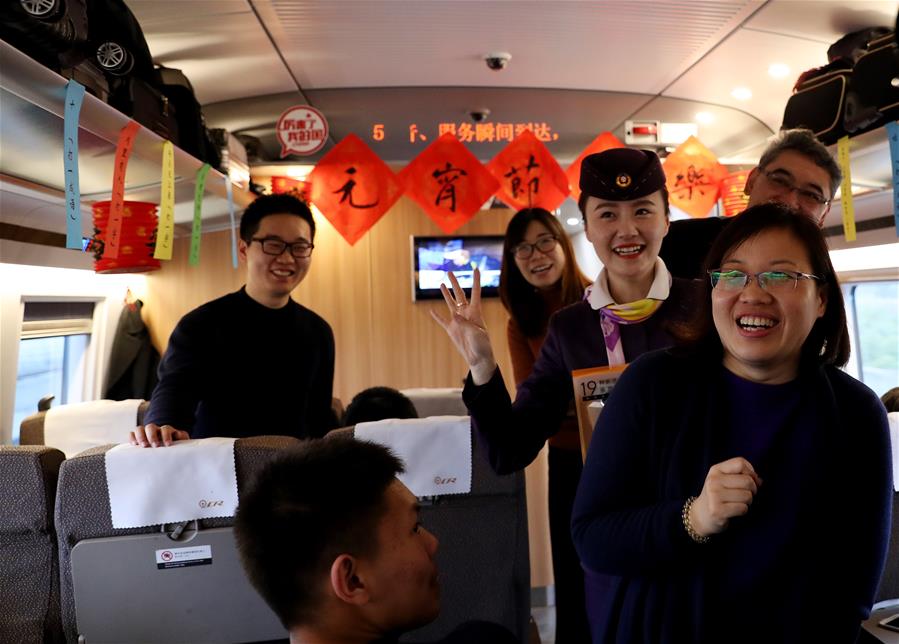 Personas adivinan acertijos de linterna para saludar al Festival de la Linterna a bordo de un tren, en Shanghai, en el este de China, el 2 de marzo de 2018. El Festival de la Linterna se celebra el 2 de marzo este a?o. (Xinhua/Fang Zhe)