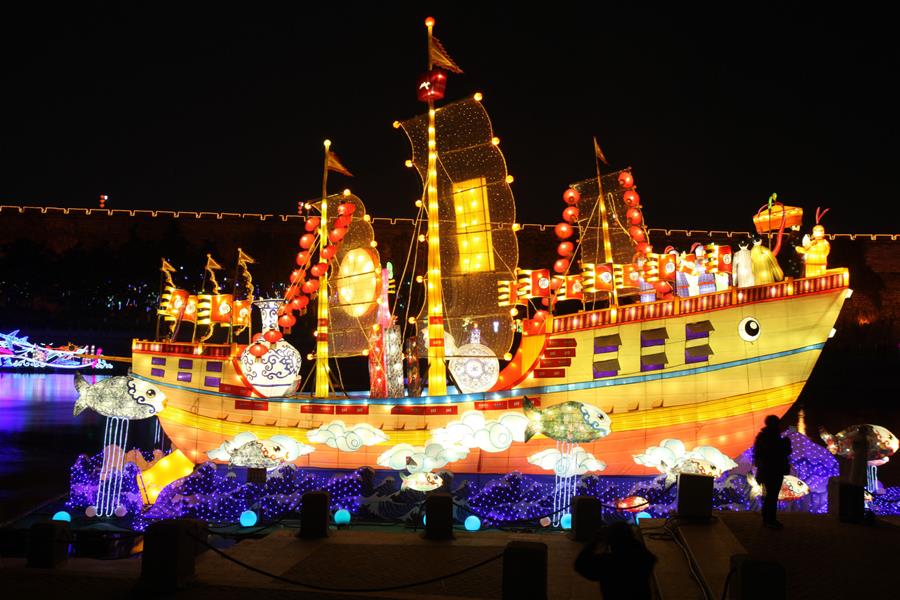 Imagen del 1 de marzo de 2018 de turistas observando una linterna con forma de bote durante un evento llevada a cabo para saludar al Festival de la Linterna, en el río Qinhuai en Nanjing, capital de la provincia de Jiangsu, en el este de China. El Festival de la Linterna se celebra el 2 de marzo este a?o. (Xinhua/Sun Zhongnan)