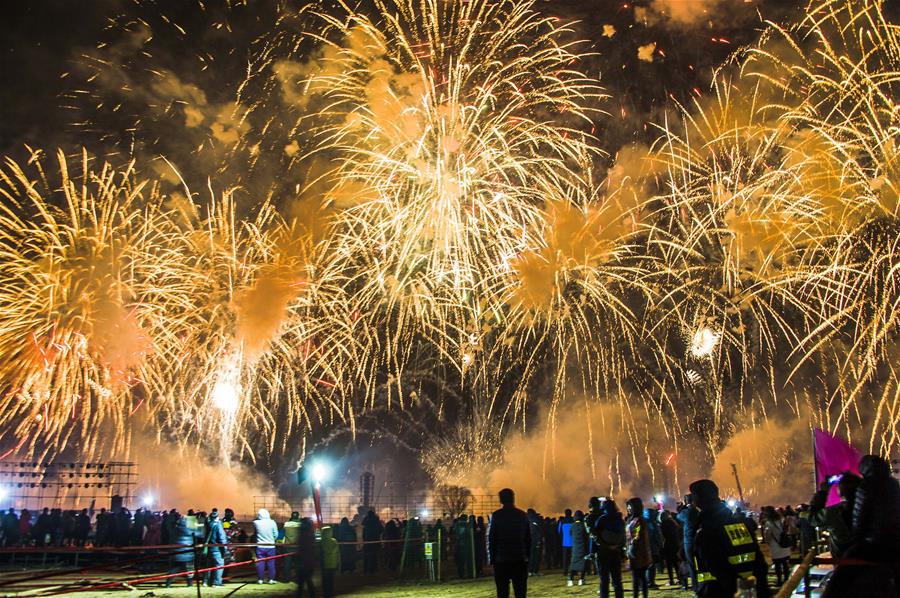 Imagen del 1 de marzo de 2018 de turistas observando la exhibición de fuegos artificiales llevada a cabo para saludar al Festival de la Linterna, en la ciudad de Jinzhong, provincia de Shanxi, en el norte de China. El Festival de la Linterna se celebra el 2 de marzo este a?o. (Xinhua/Liang Shengren)