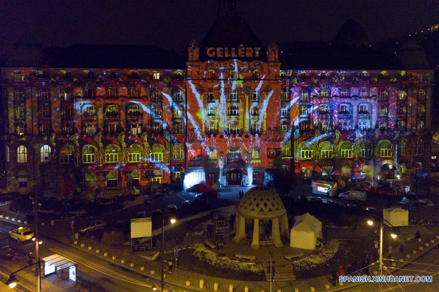 Un trabajo de animaciones en video sobre China es proyectado en la fachada del Hotel Gellert, para celebrar el A?o del Turismo entre China y la Unión Europea (UE) en Budapest, Hungría, el 3 de marzo de 2018. (Xinhua/Attila Volgyi)