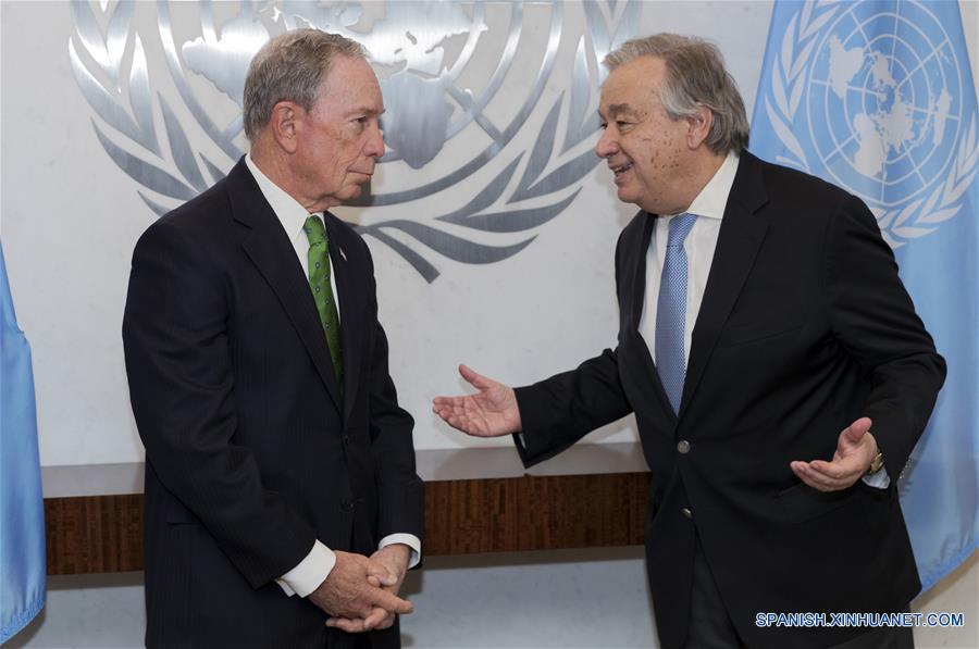 El ex alcalde de Nueva York, Michael Bloomberg (i), conversa con el secretario general de la Organización de las Naciones Unidas (ONU), António Guterres (d), en la sede de la ONU, en Nueva York, Estados Unidos, el 5 de marzo de 2018. El ex alcalde de Nueva York Michael Bloomberg fue nombrado enviado especial para acción climática del secretario general de la ONU, António Guterres, informó el lunes el servicio de prensa de la ONU. (Xinhua/Li Muzi)