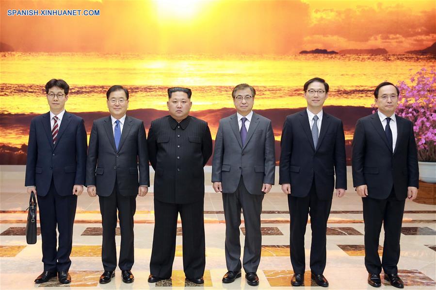 PYONGYANG, marzo 6, 2018 (Xinhua) -- Imagen cedida por la Agencia Central de Noticias Coreana (KCNA, por sus siglas en inglés) el 6 de marzo de 2018, de Kim Jong Un (3-i), máximo líder de República Popular Democrática de Corea (RPDC), posando con miembros de la delegación de República de Corea. El máximo líder de la República Popular Democrática de Corea (RPDC), Kim Jong Un, alcanzó un "acuerdo satisfactorio" con el jefe de la delegación especial de la República de Corea, que se encuentra en Pyongyang, para celebrar una cumbre con el presidente surcoreano, Moon Jae-in, informó el martes la agencia oficial de noticias de la RPDC, KCNA. (Xinhua/KCNA)