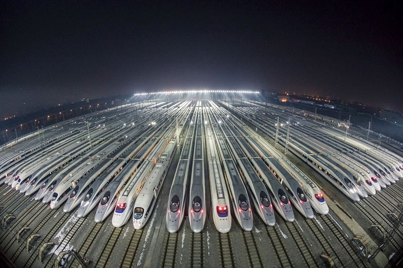 Vista del depósito de trenes de la estación de Wuhan en la provincia de Hubei, donde más de 100 trenes están listos para partir. Foto / Diario del Pueblo