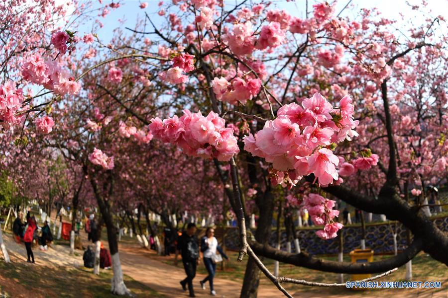 Turistas observan flores de cerezo, en el Parque Yuantongshan, en Kunming, capital de la provincia de Yunnan, en el suroeste de China, el 6 de marzo de 2018. Las flores de cerezo en el Parque Yuantongshan de Kunming son una atracción de primavera muy popular entre locales y turistas. (Xinhua/Lin Yiguang)