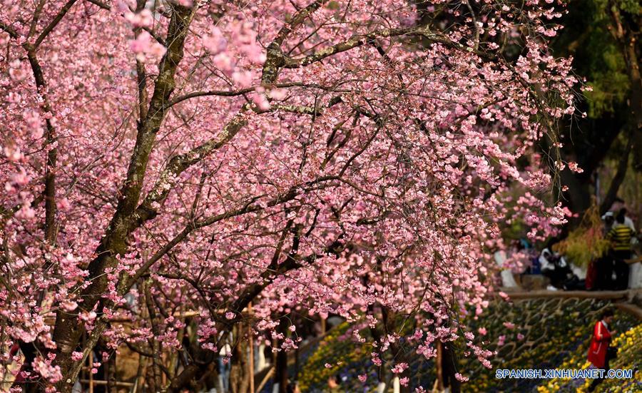 Turistas observan flores de cerezo, en el Parque Yuantongshan, en Kunming, capital de la provincia de Yunnan, en el suroeste de China, el 6 de marzo de 2018. Las flores de cerezo en el Parque Yuantongshan de Kunming son una atracción de primavera muy popular entre locales y turistas. (Xinhua/Lin Yiguang)