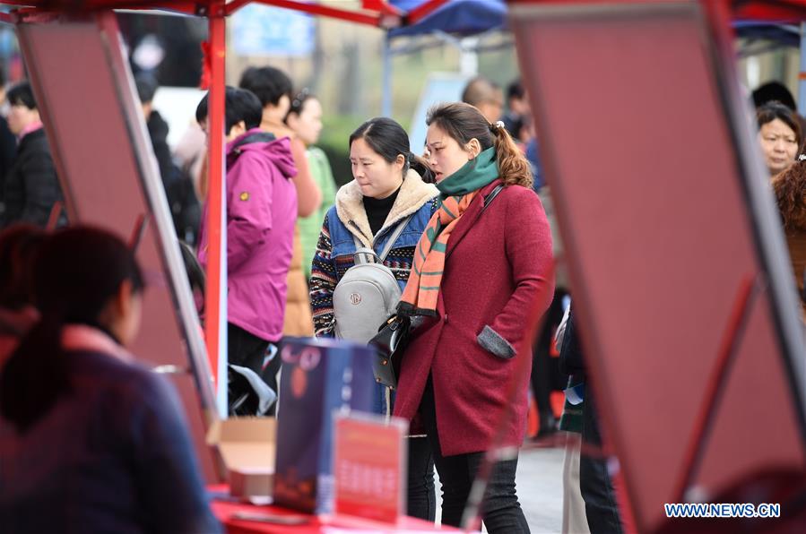Feria de oportunidades laborales para mujeres. Este evento fue organizado por el sector de recursos humanos del área de Desarrollo Económico y Tecnológico de Hefei en colaboración con la comunidad local. 50 empresas de la ciudad ofrecen más de mil oportunidades de trabajo. Hefei, provincia de Anhui, 6 de marzo del 2018. [Foto: Xinhua]