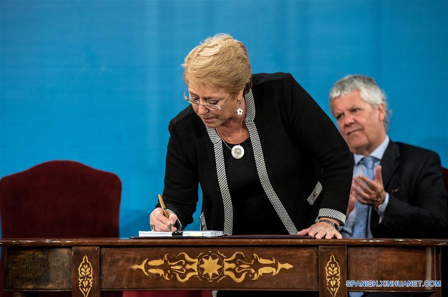 La presidenta de Chile, Michelle Bachelet, encabeza la firma del proyecto de Ley de Reforma Constitucional que establece una Nueva Constitución para Chile, en el Palacio de La Moneda, en Santiago, capital de Chile, el 6 de marzo de 2018. La presidenta de Chile, Michelle Bachelet, presentó y firmó el martes en el Palacio de La Moneda en Santiago el proyecto de Ley de Reforma Constitucional que establece una Nueva Constitución para Chile, instancia que deberá ser analizada por el Congreso para su aprobación, a sólo seis días de entregar el poder, de acuerdo con información de la prensa local. (Xinhua/Jorge Villegas)